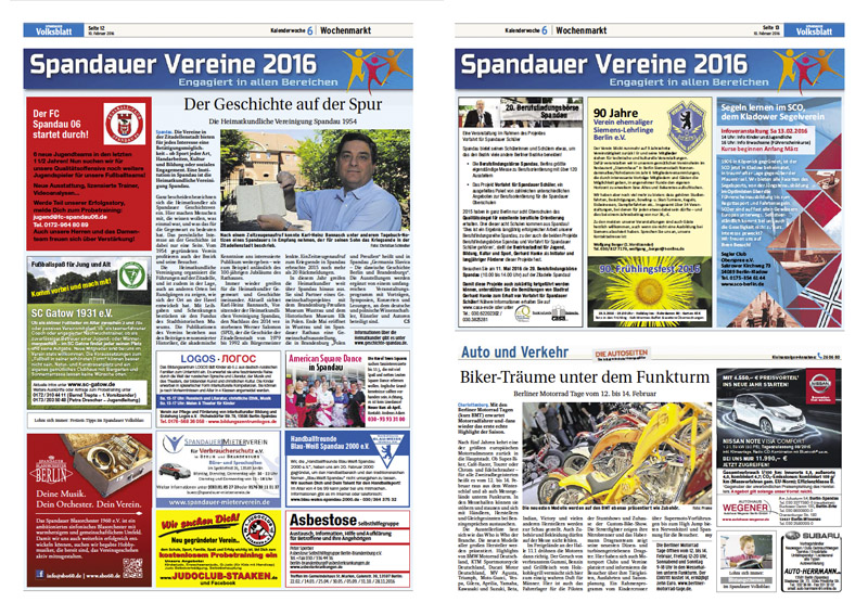 Am 3. Februar erschien im SPANDAUER VOLKSBLATT zum zweiten Mal das Sonderthema „Spandauer Vereine“, in dem sich Vereine zu besonders günstigen Bedingungen mit einem Inserat vorstellen konnten. Obwohl das Sonderthema wieder große Resonanz fand, wurde doch beschlossen, es in dieser Form nicht zu wiederholen. Es hat sich herausgestellt, dass ein fester Zeitpunkt nicht für alle Vereine günstig ist.