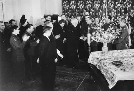 Erich Lezinsky bei seiner Ansprache anlässlich der Übergabe der Zeitungslizenz für das Spandauer Volksblatt durch Vertreter der britischen Militärregierung im März 1946 - Teilen Sie uns bitte mit, wenn Sie einzelne Personen identifizieren können!