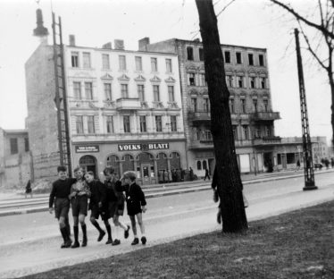 Das Verlagsgebäude der Spandauer Zeitung, später des Erich Lezinsky Verlags mit dem Spandauer Volksblatt am „Hafenplatz“, Neuendorfer Straße 101 (ehemals 1 Berlin 20), in der Nachkriegszeit, wohl 1947/48; im Nebenhaus befand sich eine Gaststätte des Spandauer Gastronomen Ludwig Metzler. Seiner Frau Gertrud soll es zu verdanken sein, dass beide Häuser noch stehen. Sie soll den Feuerwehrleuten Zigaretten oder Schokolade zugesteckt haben, um einen Brandherd in der 101 zu löschen. Die meisten anderen Häuser in der Umgebung waren dem Bombenkrieg zum Opfer gefallen.