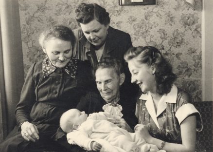 Fünf Generationen, 1950: in der Mitte Ururgroßmutter „Mutter Böhm“, links Urgroßmutter Martha Hintze, oben Oma Gertrud Metzler, rechts die junge Ingrid Lezinsky (geb. Metzler) und Sohn Rainer Lezinsky