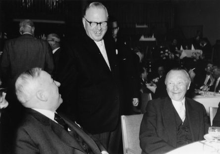 Gastronom Ludwig Metzler, Vater der späteren Verlegerin Ingrid Below-Lezinsky, im Gespräch mit Bundeskanzler Konrad Adenauer und dem Bankier und CDU Parlamentarier Robert Pferdemenges („Graue Eminenz der Bundesrepublik“, „Finanzmagnat im Schatten“); Ludwig Metzler schildert den beiden Herren eine Begebenheit aus dem Jahre 1922 in Köln, die von Konrad Adenauer bejaht wird und Gelächter auslöst. Das Bild stammt wohl vom Ende der 50er, Anfang der 60er Jahre. Ludwig Metzler organisierte damals internationale gastronomische Veranstaltungen.