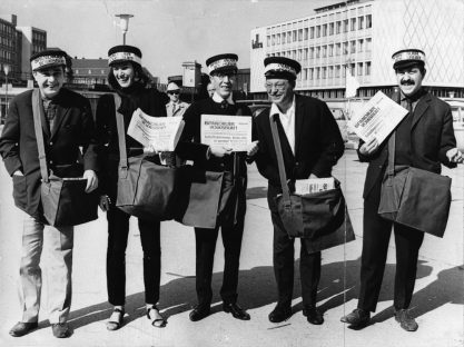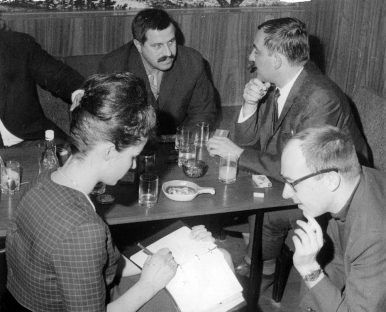 Wolfgang Gruner, Wolfgang Neuss, Günther Grass und andere Linksprominente bei Ihrer Werbeaktion für das Spandauer Volksblatt 1966