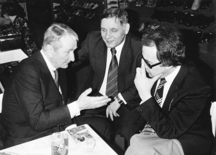 Joachim Below im Gespräch mit Gerhard Dünnhaupt (rechts), Anzeigenleiter des Erich Lezinsky Verlags und Mitbegründer des Spandauer Anzeigers, und Herrn Galipp vom Schuhaus EGA; wohl Ende der 70er, Anfang der 80er Jahre