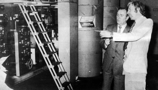 Rainer Lezinsky, damals Betriebsleiter des Erich Lezinsky Verlags, erklärt Bezirksbürgermeister Werner Salomon am 4. oder 5. Juli 1979 die Rotationsmaschine.