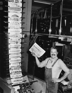 Alle Produkte des Verlags am Auswurfband der Rotationsmaschine angeheftet: Zeitungen für fast alle demokratischen Parteien, Werbeblätter für Firmen, die TAZ, der Spandauer Anzeiger und das Spandauer Volksblatt; 80er Jahre