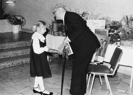 Ludwig Metzler dankt Urenkelin Kathrin Lezinsky für ihre Gratulation und ein Geschenk, das sie soeben aus Anlass der Feier seines 80. Geburtstags überreicht hat. Ludwig Metzler (1899 – 1989) stammte aus dem Saarland. In Berlin betrieb er in den 20er und 30er Jahren u.a. eine bedeutende Kellner- und Barkeepervermittlung und war für viele bedeutende Hotels und den Genfer Verband / Internationale Barkeeper Union tätig. Nach dem Krieg leitete er zeitweise die britische Offiziersmesse in Ruhleben und baute später in Spandau das „Haus Metzler“ am Askanierring als stadtbekanntes Speiselokal auf. Er soll Erich Lezinsky mit einem Kredit beim Aufbau des Spandauer Volksblatt unterstützt haben.