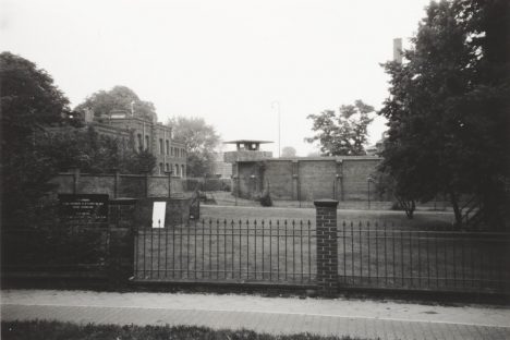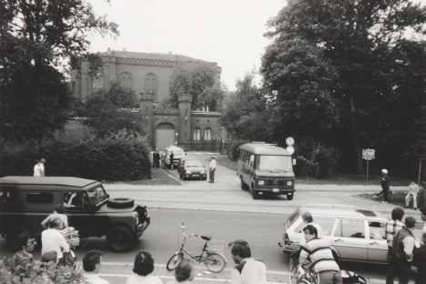 Wohl August 1987, nach dem Tod des ehemaligen Hitler-Stellvertreters Rudolf Hess vor dem Kriegsverbrechergefängnis in Berlin-Spandau. In diesem ehemaligen deutschen Militärgefängnis saß auch SPD Mann Erich Lezinsky in der Nazizeit für einige Zeit ein.