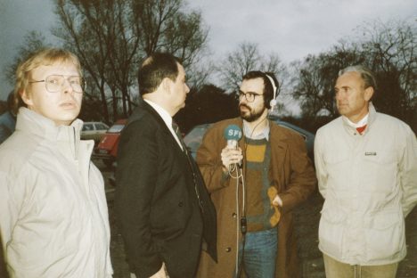 Der damalige Bundesumweltminister Klaus Töpfer Anfang der 90er Jahre bei einem Besuch des AK Gatow am Gatower Dorfrand. Links Andreas Kalesse, heute Stadtkonservator der Stadt Potsdam und der ehemalige Vorsitzende des AK Gatow Elmar Coenen von der CDU.