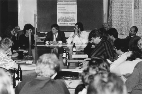 Olaf Lezinsky im gestreiften Hemd am Tisch; das Foto zeigt eine Diskussionsveranstaltung der linksliberalen Jungdemokraten in den 80er Jahren (in den Räumen des Rings politischer Jugend am Kurfürstendamm) mit dem damals sehr bekannten grünen Politiker und späteren SPD Bundesinnenminster Otto Schilly. Neben Schilly sitzt der spätere Berliner Journalist und Fernsehreporter Christian Walter, der dann vor der Beteiligung des Axel Springer Verlags eine Zeitlang als Projektkoordinator beim Spandauer Volksblatt tätig war. Rechts zurückgelehnt der ehemalige Berliner Landesvorsitzende der FDP Jürgen Kunze