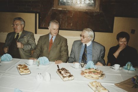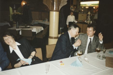 Berliner Zeitungsverleger Treffen Ende der 80er Jahre. …. Dr. Hedeler, ein Geschäftsführer des Tagesspiegel, der Axel Springer Manager Dietrich Rusche, der den Springer Einstieg beim Spandauer Volksblatt mit begleitete. Rechts das Ehepaar Wolfgang und Karin Büsch. Wolfgang Büsch war jahrzehntelang Justiziar des Verbandes der Berliner Zeitungsverleger und Rechtsanwalt und Notar des Erich Lezinsky Verlags.