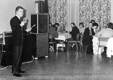Rainer Lezinskys 40er Geburtstag 1990 kurz nach dem Mauerfall; Olaf Lezinsky hält eine Ansprache im ehemaligen „Stasiheim“ auf der Glienicker Seite des Glienicker Sees.