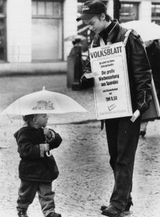 1966: Günther Grass verkauft das Spandauer Volksblatt in „Berlin“ am Kurfürstendamm. Damals wollten eine Reihe linksliberaler Prominenter das Spandauer Volksblatt als publizistische Alternative zur Springerpresse ausbauen.