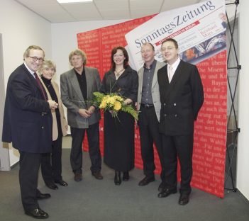 Dr. Dirk Hermann Voß und Gattin (St. Ulrich Verlag), Künstlerseelsorger Pater Astan von den Berliner Salesianern, Evely Christel (Redaktion Katholische Sonntagszeitung Berlin), Rainer und Olaf Lezinsky. 2004 übernahm der Augsburger Bistumsverlag die Herausgabe der katholischen Kirchenzeitung in Berlin. Das Erzbistum Berlin hatte nach seiner Beinahe-Pleite 2003 fast alle wirtschaftlichen Aktivitäten weitgehend eingestellt. So auch die eigene Verlegerschaft an einem Kirchenblatt über den Morus Verlag. Die Aufnahme entstand am 25.10.2004 bei der Einweihung der neuen Redaktionsräume. Der Verlagsservice Lezinsky betreute seitdem den lokalen Anzeigenverkauf für das Blatt.
