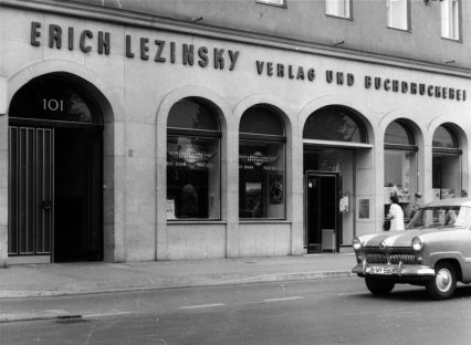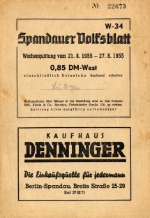 Das Verlagsgebäude der Spandauer Zeitung, später des Erich Lezinsky Verlags mit dem Spandauer Volksblatt am „Hafenplatz“, Neuendorfer Straße 101 (ehemals 1 Berlin 20), in der Nachkriegszeit, wohl 1947/48; im Nebenhaus befand sich eine Gaststätte des Spandauer Gastronomen Ludwig Metzler. Seiner Frau Gertrud soll es zu verdanken sein, dass beide Häuser noch stehen. Sie soll den Feuerwehrleuten Zigaretten oder Schokolade zugesteckt haben, um einen Brandherd in der 101 zu löschen. Die meisten anderen Häuser in der Umgebung waren dem Bombenkrieg zum Opfer gefallen.