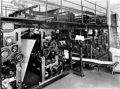 Alle Produkte des Verlags am Auswurfband der Rotationsmaschine angeheftet: Zeitungen für fast alle demokratischen Parteien, Werbeblätter für Firmen, die TAZ, der Spandauer Anzeiger und das Spandauer Volksblatt; 80er Jahre