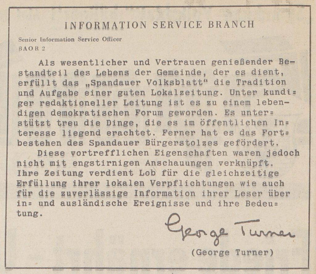 Das Konvolut, das aus vielen alten Fotokopien, klassischen Amtsbriefen, Memoranden, Durchschlägen mit zahllosen Verweisen an viele Empfänger besteht, endet am 31. Dezember 1952. Es schließt mit ein paar jovialen Sätzen und verweist auf die Sonderausgabe zur Nr. 2000 des Spandauer Volksblatt. In dieser hatte der verantwortlichen Senior Information Officer George Turner ein Grußwort der Militärregierung beigesteuert. Damit „seien dann hoffentlich die intensiven und unerfreulichen Streitereien der letzten Monate beendet“. Das Grußwort ist beigefügt und in der gleichen Ausgabe gab es neben zahllosen anderen Gratulationsnoten aller Parteien und gesellschaftlicher Gruppen auch solche von Ernst Reuter, Otto Suhr und weiteren SPD-Vertretern